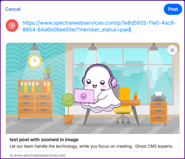 If you load a zoomed out photo as your feature image, it'll work both on Ghost and when your site is shared. That is by far the easiest option.